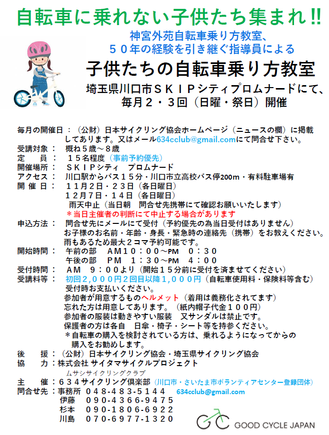☆募集中☆【子供たちの自転車教室10月、11月、12月】主催634サイクリング倶楽部