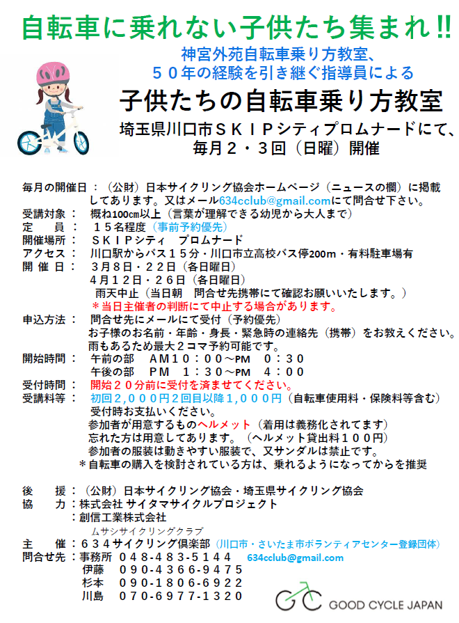 ☆募集中☆【子供たちの自転車教室3月、4月】主催634サイクリング倶楽部